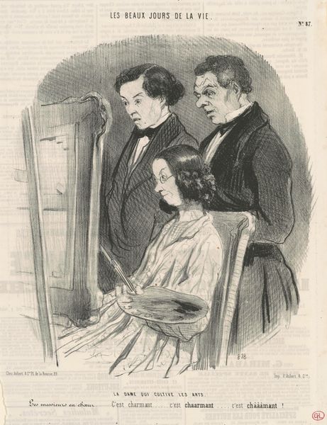 Editor: So, this is Frédéric Bouchot’s “The Unfortunate Teacher of Musical Theory” from 1840, a lithograph drawing. It strikes me as funny, but also a bit sad. I mean, look at the poor teacher's face! What do you see in this piece, beyond the obvious comedic frustration? Curator: Ah, yes! The beleaguered professor. For me, it’s a beautiful example of how caricature can be a surprisingly insightful window into human emotion, right? He’s stuck between a rock and a hard place... or rather, a piano and two less-than-angelic pupils! Notice how Bouchot uses exaggeration to highlight the tension: the teacher’s furrowed brow, the students’ strained expressions. It’s all delightfully melodramatic, isn’t it? I imagine a dreadful atonal squawking echoing through the room. Does it make you think about anyone you know? Editor: Absolutely! My piano teacher in grade school had that same exasperated look…only my teacher did not have to do his best under the weight of such horrible, puffed-sleeve monstrosities for girls. Did children really dress like that in 1840s? Curator: Styles could get pretty out there. I find myself wondering what kind of music they were attempting to play! What do you imagine their lesson sounds like? Off-key, screeching, maybe a few missed notes that ring into next Tuesday? Perhaps, the beauty of it all, is not merely what’s seen on the page, but felt when viewing it. I feel, in my mind, all the terrible practice, that happened before any real song comes through the notes. Editor: This image has made me feel much more sympathetic towards teachers, particularly piano teachers. Next time, I will cut them some slack for pushing students in such peculiar era pieces. Curator: Indeed! Maybe we should all buy our childhood music teachers some coffee and a sincere ‘thank you!’ Let’s appreciate the dedication involved, both on the part of the teacher, and for students during musical development and history.