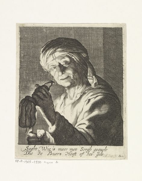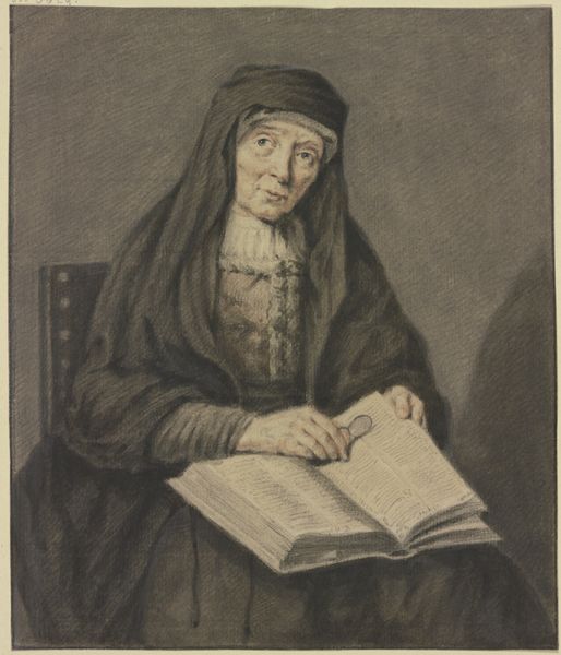 Curator: Welcome. We are standing before James McArdell's "Portret van een oude lezende vrouw", or "Portrait of an old woman reading," dating roughly between 1738 and 1765. It is currently housed here at the Rijksmuseum. The print employs the techniques of etching and intaglio on paper and is based on a painting by Rembrandt of his mother. Editor: The initial impression is quite somber, almost severe. The figure is cloaked in darkness, intensely focused on her book, suggesting deep contemplation and knowledge sought from the text. I wonder, what was the material process of producing this image and the source that served as its origin? Curator: McArdell worked from a Rembrandt painting and employed the labor-intensive intaglio printing method, manipulating tools to carve the image onto a metal plate. The plate would then be inked and pressed onto paper to create multiple impressions, which speaks to a culture that embraced replicability and the commodification of images. These reproductions, sold to the public, also extended Rembrandt’s visual language to wider audiences. Editor: Indeed, it feels like an act of preservation and dissemination of visual motifs. The woman's visage, heavily lined and aged, is framed by a dark hood. I can see parallels between her clothing and a habit, underscoring wisdom or, more subtly, social identity through distinct dress conventions, yet it doesn't fully read as religious due to the reading itself. This juxtaposition creates a unique psychological tension. What book do you suppose she is studying, or could this printed medium lend insights? Curator: It's difficult to know definitively what the woman is reading. Print enabled mass communication during a burgeoning market. I wonder how it functioned in early society. Was this the tool for democratization of access or limited by social structure? This form challenges our accepted conventions today as access to information via tablets/phones become widespread with manufacturing and labor implications for sustainability in a way unavailable in prior periods. Editor: That’s fascinating; each object tells an important, complex story. The simple rendering of her posture, slumped yet attentive, reveals both resignation and purpose. It’s an emotionally resonant piece that suggests she draws solace and enlightenment. Curator: Absolutely, I'm left considering how a culture of mechanical reproduction facilitated the distribution of ideas. Editor: And I’m left pondering how consistent are cultural markers and social structures.