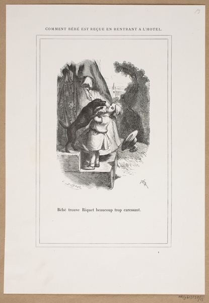 Curator: Here we have an intriguing piece from the Harvard Art Museums, "Beiss mal ah, Dänschen!" by an anonymous artist. It feels like a storybook illustration. Editor: The lithographic process interests me here. Look at the fine lines and the dense crosshatching used to create such delicate shading. It's painstaking. Curator: It recalls a kind of innocence, doesn't it? This act of sharing food is laden with cultural significance. The forest setting evokes a sense of primal connection. Editor: I wonder about the social context. Was this distributed widely? Who was the intended audience for this image, and what materials made it affordable? Curator: The act of sharing, almost a communion, is very present. I suspect, from the title, that this image would have carried a lot of meaning for German-speaking communities. Editor: The labor involved must have been considerable, particularly given its likely affordability. The act of mass production surely shifts its inherent cultural value. Curator: Indeed, both the artistic skill and the means of production give us a glimpse into its cultural significance and the stories it could tell. Editor: Yes, it's fascinating how the materiality and social context shape our understanding of visual culture.