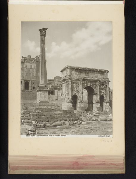 Editor: So, this photograph by Giacomo Brogi, taken between 1870 and 1881, depicts the Arch of Titus in Rome. It's a powerful image, a stoic cityscape frozen in time. What social dynamics might be in play when this photograph was created, and how do they speak to Rome's power then and now? Curator: An interesting question. I'm immediately drawn to considering how photography itself functioned as a tool of power and representation in the 19th century. The act of capturing the Arch of Titus, a symbol of Roman imperial triumph, becomes a way of possessing and disseminating that historical power. Think about who had access to photography at that time, who was controlling the narrative? Editor: That makes sense. So, the choice to photograph this specific monument speaks volumes? Curator: Absolutely. It’s not just a landscape; it's a deliberate framing of history through a specific lens. We have to consider the political context of Italy during this period. The country was in the throes of unification – the Risorgimento – that wanted to lay claim to its Roman past, which becomes this sort of a legitimizing narrative. This imagery helps visualize and popularize that agenda. What do you make of the absence of people in the image? Editor: It almost feels staged, doesn’t it? Like the photographer wanted to present this idealised image of Rome's past, without the messiness of contemporary life. Is it also fair to assume that by framing it in its isolation, there’s almost a glorification of ancient patriarchy, and how it impacts identity and our modern gaze? Curator: That’s insightful. It highlights how even seemingly straightforward documentation is imbued with choices that reflect power dynamics and influence perceptions. Understanding photography, or really any art, as cultural product forces us to constantly interrogate not just *what* we see, but *why* and *how* we're seeing it. Editor: I will definitely keep that in mind when studying historical imageries from now on! Thank you!