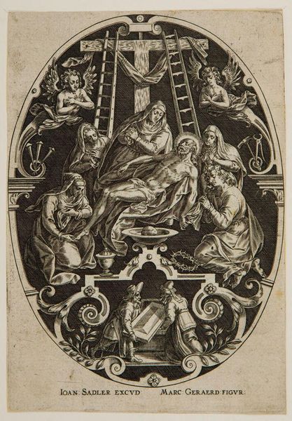 This is Jan Sadeler the Elder’s engraving, "Lamentation, from Passion of Christ," now at the Art Institute of Chicago. Dominating the scene is the lifeless body of Christ, surrounded by mourners and symbols of his crucifixion, all framed within an ornate oval. The cross looms large, flanked by ladders, while below, the crown of thorns lies discarded. The image calls to mind the deposition scenes of antiquity, where the removal of heroes from battlefields held deep significance. But here, Christ's limp form echoes a universal Pietà—a mother's grief mirrored across cultures, from ancient laments to modern expressions of sorrow. Notice too, the ladder. A potent symbol—evoking not just Christ's descent from the cross, but the very act of ascent and descent that appears in dreams across time and cultures, as a bridge between realms. The emotional power of this image lies in its ability to tap into our collective memory of loss and sacrifice. It is a visual echo resonating through centuries, reminding us that these symbols never truly die, they simply transform.