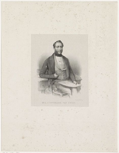 Here is a portrait of Willem Petrus Jacobus Maas Geesteranus, made by Johan Hendrik Hoffmeister using lithography. The portrait employs subtle gradations of gray to model the sitter’s features and clothing, achieving a lifelike quality. Hoffmeister uses sharp, precise lines to define the contours of his face and the details of his attire, which contrast with the softer, smudged shading that creates depth and volume. This manipulation of line and tone suggests a sophisticated understanding of light and shadow. The formal composition, with its emphasis on clarity and structure, reflects a broader artistic engagement with the representation of identity and social standing. What might the interplay between these formal elements and the subject's social context reveal about the construction of self in the 19th century? This portrait invites us to consider how artistic techniques intersect with cultural codes to convey meaning.