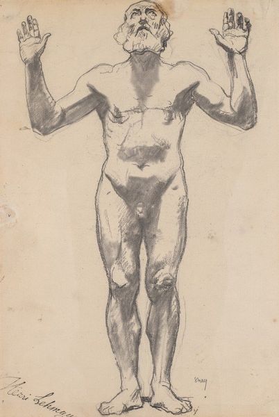 This is a drawing of a standing male model created by Wilhelm Marstrand. The figure's pose, with arms crossed, is a powerful motif that echoes through art history. Consider, for instance, the ancient sculptures of emperors, where this gesture signified authority and control, or its appearance in early Christian art, where crossed arms symbolized humility and piety. Here, the model’s posture suggests a psychological withdrawal, a self-containment. Think of how often we see this gesture in portraits across time, each instance subtly shifting its meaning. It is an interesting symbol; the crossing of the arms can appear as a sign of closure or defensiveness. Yet, in the context of academic study, as may be the case here, it seems to express introspection, a thoughtful reserve that engages us on a deeper, almost subconscious level. This drawing reveals how gestures resonate through history, evolving yet retaining echoes of their past.