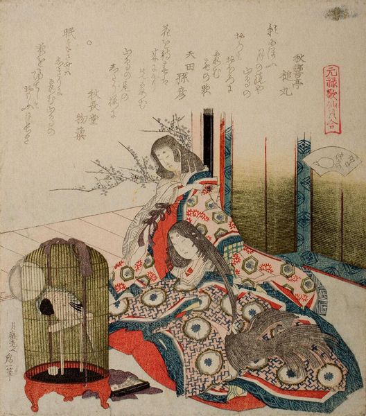 Curator: Let's explore this intriguing print by Katsushika Hokusai, titled "Saddle, Wringer, Smoking Outfit and Plum Branch/ The Cotton Spinning Horse (Watakuri uma)," part of his "A Selection of Horses" series. Editor: It’s quite charming! There's a domestic tranquility to it. I am drawn to the everyday objects rendered with such care. Curator: Indeed! Hokusai's focus on the tools of daily life elevates them. The saddle, for instance, isn’t just a saddle; it becomes a symbol of labor and travel. Consider the plum branch—a traditional signifier of spring and renewal. Editor: And the cotton spinning apparatus highlights the materiality of textiles, the labor involved in creating fabric. You see the materials, the woven basket, the cloth itself. It points to production. Curator: Absolutely. The objects collectively create a cultural narrative. Editor: The artist reminds us of the connection between human work and natural cycles. A beautiful meditation.