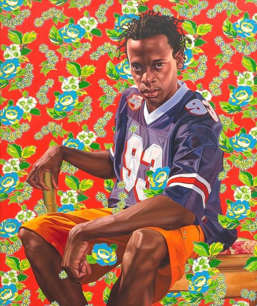 Kehinde Wiley made this painting, St. Francis, with oil on canvas and he’s really pushing the boundaries of portraiture, remixing historical styles with a totally contemporary sensibility. Look at how he’s built up the layers of paint, using a smooth, almost airbrushed technique for the figure, so different from the flat decorative patterns in the background and foreground. And what about the colors? Wiley is really playing with contrast here. The coolness of the blues and whites against the warmth of the figure's skin tones. It's all so deliberate, each detail, like the light catching the number 14 on the football jersey, has been carefully considered. Then you notice the floral flourishes. They seem to both frame and liberate the figure, creating a kind of tension or visual buzz. This painting reminds me of Mickalene Thomas' work, in the way she reclaims and reimagines portraiture, giving it a new life and energy. What I love most is how this work doesn't settle for easy answers, but rather invites a conversation, a kind of visual back-and-forth that keeps unfolding with each viewing.