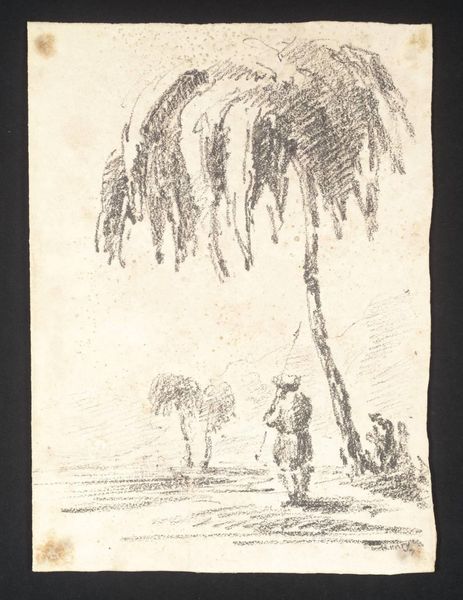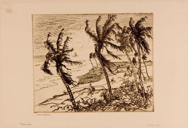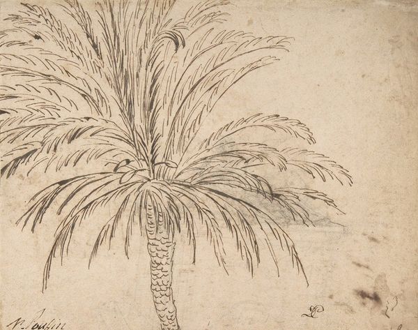 Editor: Here we have Leo Gestel’s "Palmboom met op de achtergrond een eiland met een vulkaan", created between 1934 and 1936. It's an ink drawing, a scene with a palm tree in the foreground, and a volcanic island sketched in the distance. It's striking how much texture he gets with simple lines. What do you see in this piece? Curator: Well, immediately, I'm drawn to the *labor* involved. Look at the density of lines creating that palm, versus the quick strokes for the volcano. What kind of pen did he use? The choice of material, ink specifically, suggests readily available, cheap for quick production, right? This forces me to consider not just *what* he depicted, but *how* and *why* he chose this particular, economical means. What does that say about his relationship to the subject? Editor: That's interesting! I was focused on the exotic subject matter but your point about the low-cost materials gives it a different feeling. Does this downplay the 'exotic'? Curator: Precisely! Consider this in the context of modernism; it directly challenges traditional boundaries. It challenges traditional boundaries of high art by examining how even 'exotic' imagery, filtered through accessible means, participates in a larger, capitalist mode of *consumption*? The drawing itself becomes a commodity, mediated through simple materials and reproduced no doubt for commercial purposes. What is your interpretation now, after discussing it from the production perspective? Editor: I get it. Instead of being some idealized view, this scene is mediated by his labor and available materials, part of a wider system, challenging romanticized landscape. I'll remember to analyze artwork using the process of making. Thank you for clarifying! Curator: Always consider materials to uncover context!