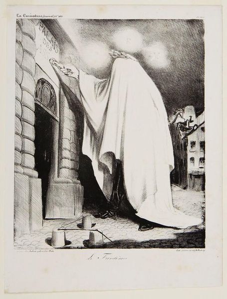 Honoré Daumier’s lithograph, *Le Fantôme*, presents us with a spectral figure rendered in stark blacks and whites. The composition centers on a ghostlike form, its draped figure dominating the foreground against a nocturnal urban setting. Daumier employs a strategic interplay of light and shadow, accentuating the eerie nature of the scene. Notice the contrast: the illuminated facade where the figure writes with the darkened street scene. The ghost could symbolize justice, seeking to illuminate corruption within the "Palais de Justice". Semiotically, the visual cues - the ghost, the legal setting - combine to question the integrity of the judicial system itself. This reading prompts us to consider the deeper, structural critique inherent in Daumier's work. The play of light and shadow, besides its aesthetic function, emphasizes a societal critique. The unresolved narrative leaves us contemplating the ever-shifting meanings of justice and power.