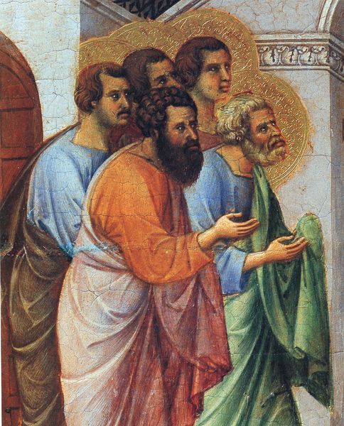 Editor: We’re looking at Duccio's "Arrest of Christ" from 1311. It’s oil on textile and I’m struck by the almost theatrical arrangement of figures and how the bright colours draw the eye. What stands out to you most in terms of its composition? Curator: I am most intrigued by Duccio's use of colour to direct the viewer's gaze, in tandem with compositional symmetry. Consider the placement and hue of figures – do you see how they create distinct, almost segmented narratives within the same panel? How do those segments enhance the painting's structure? Editor: I see what you mean. It’s like each little pocket of action is framed by color, especially the blues and reds. Are you suggesting that these distinct scenes within a scene affect the overall balance? Curator: Precisely. Furthermore, observe the manipulation of depth. The figures seem somewhat flattened against the gold background, denying a conventional Renaissance perspective. What effect does that have? Editor: I guess it flattens the narrative, making everything feel equally important – all pieces of the same event happening at once, and denying realistic depth focuses attention on the forms themselves. Curator: Good. The denial of traditional depth pushes us toward a more symbolic interpretation of space, emphasizing the emotional and theological drama. Considering this flattened picture plane, the bright, localized colours, how might this alter our perception of the scene depicted? Editor: Well, I'd never thought about the flattened depth, but you're right. It all adds up to something pretty powerful and unique to the era. Curator: Indeed. It is by interrogating elements such as colour and spatial depth, that we begin to appreciate how Duccio transcends conventional narrative to make an emphatic pictorial and conceptual statement.
