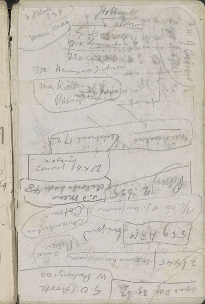 Curator: It looks like whispers of a memory fading into paper. Washed-out and haunting. Editor: Indeed! We're looking at "Abklatsch van de krijttekening op pagina 26" which translates to "Rubbing of the chalk drawing on page 26", a work on paper in graphite by Willem Witsen, likely created between 1897 and 1899. You know, the Rijksmuseum holds quite a few of his sketchbooks, offering glimpses into his artistic process and subjects. Curator: Ah, "rubbing" clarifies things; I couldn’t quite decipher what I was seeing. There is definitely an Impressionistic bent there. It feels less like a definitive portrayal and more like trying to capture the residue of something just beyond our grasp. What would he have been documenting through this medium? Editor: Well, considering Witsen’s social circles and involvement with the Dutch Impressionist movement, he would have been trying to capture the world around him and experiment with visual styles of documenting that moment in time. And remember, this technique was quite popular at the time for transferring images, so its function was also quite utilitarian for producing the book itself. Curator: Interesting! So perhaps, these ghostly marks allowed for something between pure reproduction, documentation and evocative expression. It lends a beautifully fragile, transitory quality to the artwork. And what of his choices in content and subject here – would he be thinking about public consumption at the time of creation? Editor: Given its existence within a sketchbook, it's possible he saw this as an internal record, more personal than public. Then again, his engagement in social art circles during that period of rising social mobility and media dissemination means it may be useful to consider both purposes intertwined and in tension, right? Curator: Yes! Exactly. The tensions between public presentation, and the intimacy of sketchbooks fascinates me; they whisper to the complicated dialogues within and around any creator. This makes me question where we might find these dialogues for ourselves, and to explore what might constitute as truly “finished”. Editor: Absolutely! And Witsen’s work invites precisely that kind of questioning about value, social function, and the role of these art objects.