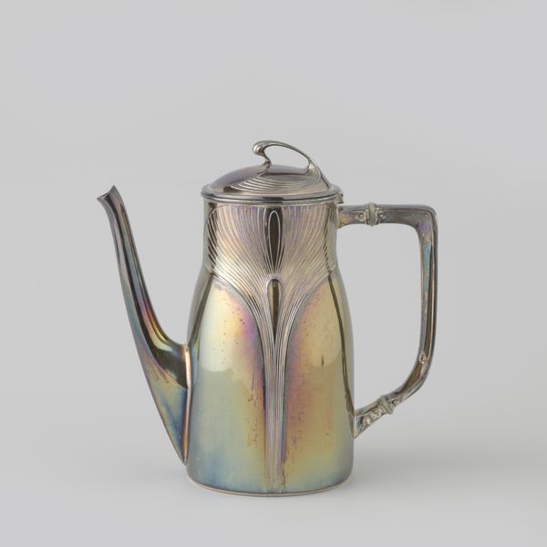 This mug was made by the Rookwood Pottery Company, which operated from 1880 to 1967. It's made of earthenware, decorated with colored slips and then electroplated with silver. The lustrous surface of the mug draws attention to the intricate process of its making. The Rookwood Pottery Company was known for its innovative use of underglaze slip painting, a technique that allowed artists to create highly detailed, painterly designs on ceramic surfaces. The silver electroplating adds a layer of luxury, transforming a functional object into a decorative showpiece. Rookwood was founded by Maria Longworth Nichols Storer, who wanted to provide opportunities for women artists. The company became successful for blending art with industry. This mug demonstrates the social context of the American Arts and Crafts movement, which sought to elevate craft to the level of fine art, while also improving industrial design. Appreciating this mug, you will gain a new appreciation for the skill of its makers and the cultural values it embodies.