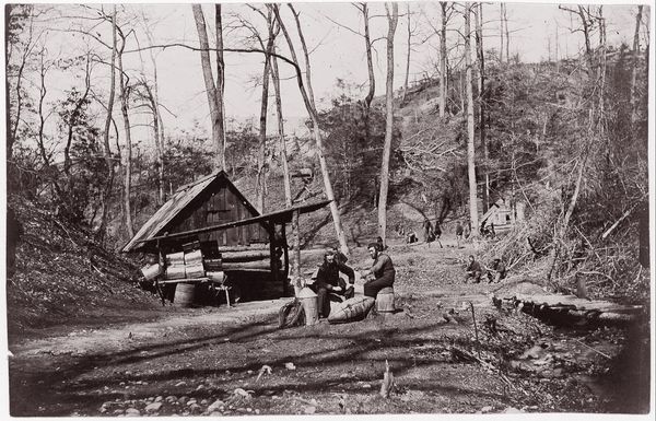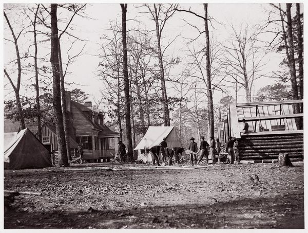 Editor: Here we have Andrew Joseph Russell's "Crow's Nest, Battery and Lookout," a gelatin-silver print from 1864. The first thing that strikes me is how still everything seems, despite it depicting what I imagine to be an active military site. How do you interpret this photograph? Curator: Consider how photography functions here. Russell captures not just a scene but also a specific moment pregnant with symbolic meaning during a divisive conflict. Notice the array of tents juxtaposed against the stark, skeletal trees; the tents provide shelter, representing fragility, while the barren branches are indicative of struggle and endurance during wartime. It feels like a still life, but the potential for violent action permeates everything, don’t you think? Editor: It definitely creates tension knowing this serenity is likely temporary. Is there significance in the figures seeming so...idle? Curator: Precisely. Consider how they embody the emotional and psychological weight of soldiers caught between action and stasis. They are placeholders, representing not just individuals but the collective memory of war: the anxious waiting, the interrupted lives. The horse and rider act as almost allegorical figures – potential harbingers of change, good or ill, within the larger narrative. Are they symbols, do you think, or part of something deeper? Editor: Perhaps the symbols lie in that in-between space—waiting, anticipating, living on the edge of constant threat? Thank you! Curator: Exactly. It’s the potent space where history and human experience converge in a single frame, constantly informing our understanding. A rich cultural artifact that we can all think about.