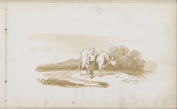 Editor: This print, "Herdersjongen met kudde in ondiep water"—that’s “Herder Boy with Cattle in Shallow Water”—is by Simon van den Berg and was made sometime between 1822 and 1891. It has such a calm feeling; I imagine the sound of trickling water and distant cowbells. What does this artwork evoke for you? Curator: The pastoral scene pulls me in, that silvery light... almost like a faded memory. It's that kind of quiet realism that gets you, isn't it? Look how the landscape seems to breathe – the soft rolling hills, the way the light hits the water... There’s such a careful rendering of textures, of the boy's simple clothes against the hide of the cattle. It’s a whole world conjured with such delicate strokes. Have you noticed how the artist creates depth by manipulating the gradations of light and shade, from darker at the fore to paler as the distance increases? Editor: Yes, it's subtle. I didn't initially catch how the varying shades create that perspective. I just liked the overall vibe. Curator: Sometimes that’s the most important part! Don't underestimate that 'vibe' – it's your intuition connecting with the artist's intent. This piece offers a romantic vision of rural life, though I bet the reality was a bit harsher. Makes you wonder, doesn’t it, about Van den Berg's own connection to this life. Did he idealize it, or truly know it? Editor: That's interesting. So, even with Realism, there’s room for interpretation and even, maybe, a bit of wishful thinking? Curator: Absolutely! Isn’t that what makes art so alive, though? This dialogue between reality and imagination?