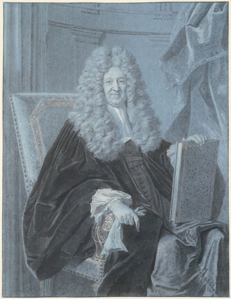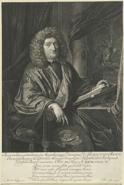 Curator: I find this piece utterly compelling. What do you make of it? Editor: Intrigued, definitely intrigued. The man is drowning in luxurious fabrics, yet there’s a real austerity to his face, and it sort of projects into the entire setting. Curator: This is “Portret van Johannes Hudde,” a portrait rendered in oil on canvas by Michiel van Musscher around 1686. The artwork finds its home here at the Rijksmuseum. Now, what symbolic cues do we see? Editor: Oh, plenty. That open book… is that some scientific or mathematical treatise? The globe in the background suggests a mind encompassing the world, ready to unlock its secrets. But also… the heaviness. Those colours—the indigo robe, the muted reds in the Persian rug—everything suggests authority tempered by introspection, maybe even melancholy. He looks so still. What do you see there? Curator: Absolutely. Hudde, of course, was no mere subject but rather the Mayor of Amsterdam and a notable mathematician. Van Musscher is, quite deliberately, associating Hudde with erudition and worldly awareness, positioning him in a realm of scholarly pursuit. See how the pen rests at the ready near his hand… he is in control of writing his legacy. The globes reference the city’s international trade. And this sumptuousness, it is meant to express not just individual status but Amsterdam's Golden Age prosperity, yes? Editor: A very cultivated image, in the fullest sense of the word. Van Musscher seems keen to imbue it with that "genre painting" feel - ordinary folk captured candidly - and instead serves us the ideal man of his time. Almost theatrical in a way. Curator: Indeed, such men epitomised Dutch society then, shaping cultural and economic narratives in lasting ways. In the lexicon of symbols and meanings, Van Musschen seems quite keen on painting an illustrious portrait of Amsterdam and one of its leading lights. Editor: Well, there we have it - a painting, then, not just of a man, but of an entire worldview. A rather beautiful and telling artifact. Curator: A remarkable artifact, showcasing one historical era and the people who shaped its very cultural awareness.