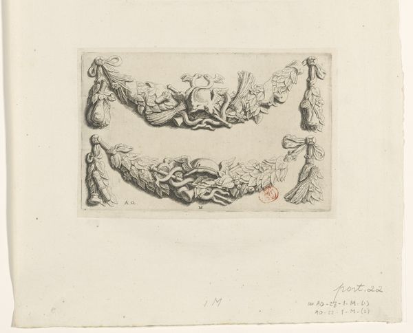 Editor: This engraving, "Guirlandes met schelpen en zeedieren," from 1719 by Hubert Quellinus at the Rijksmuseum, is a pair of festoons crafted from sea life. What strikes me is how these typically disparate, organic forms have been made regular, almost architectural. What do you see in this piece? Curator: I see more than just decoration, I see echoes. Consider the garland, traditionally woven of flowers and foliage. Quellinus replaces flora with fauna of the sea, turning an earthly symbol into something…aquatic. The baroque embraced elaborate ornamentation, so what’s conveyed by the selection of these specific images, repeated and intertwined? Editor: Well, seashells have always had symbolic meanings tied to birth and femininity… Curator: Precisely. And lobsters, crabs, and various mollusks – what emotional or cultural memories might they trigger? Remember, these symbols aren’t fixed; they shift in meaning depending on time and culture. Does this garland evoke a sense of abundance or perhaps the darker, less explored depths of the subconscious? Editor: I guess I hadn't thought about how a lobster could carry weight. The festoon makes me consider mortality… as in “dust to dust,” perhaps “sea to sea?” Curator: Indeed. These symbols work upon our memory – individual and collective. The artist taps into our inherited understanding of nature, cycles, and even our fears. This print shows a fascinating use of everyday imagery imbued with layered cultural weight. Editor: That makes me see these sea creatures in a whole new light, transformed from simple decorative motifs into meaningful cultural symbols.