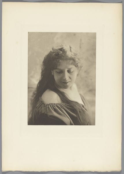 Editor: So, this is a photograph, "Portret van Phyllis Broughton," taken before 1884. It's stunningly old-fashioned. There’s a real stillness to it, almost like a painting. What strikes you most when you look at this portrait? Curator: Oh, the sheer theatricality of it all! It’s less a straightforward portrait and more of a constructed persona. The soft focus, the pose, even the feathery boa… It’s as if Phyllis Broughton is playing a role, perhaps auditioning for immortality. Do you get that sense too, that this isn't quite *real* Phyllis, but an idealized version? Editor: Absolutely! There's something almost dreamlike about the way she’s presented. That soft focus almost blurs the line between reality and fantasy. It does seem staged, as if every detail were planned. How much do you think the photography of the time influenced this style of presentation? Curator: Hugely. Early photography was still finding its feet, wasn’t it? Portraiture, in particular, borrowed heavily from painting techniques – the lighting, the composition, even the props. Think about it, before photography, a portrait was a privilege only afforded to the wealthy. Suddenly, it was democratized. People could, quite literally, capture a moment in time, an imagined version of themselves. It’s almost like early selfie culture, wouldn’t you agree? Editor: I see your point! So it was less about capturing reality and more about creating an aspirational image. It’s a fascinating blend of art, technology, and social aspirations. I hadn’t thought about it that way before! Curator: And isn't that the magic of art? It’s not just *what* you see, but *how* you see it, and what it tells you about a moment in time, filtered through a creative lens. I find myself wondering, what other hidden layers are waiting to be discovered in works such as this one?
