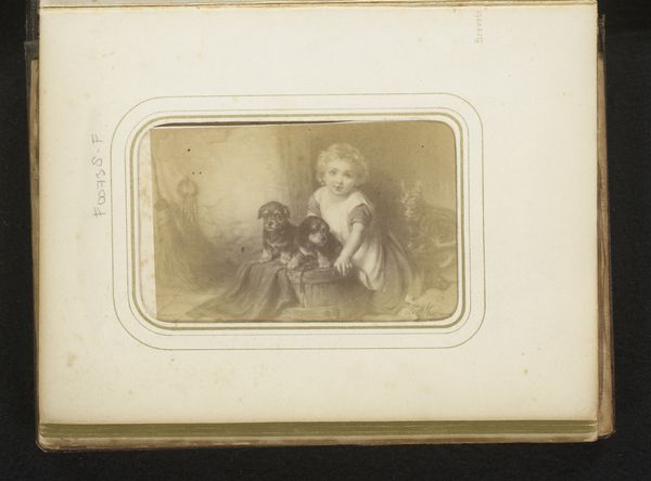 Editor: Here we have "Fotoreproductie van een schilderij van een peuter en een hond door George Augustus Holmes", likely made between 1870 and 1890, created using watercolor. It's an interesting scene, so intimate. What do you see in this piece that I might be missing? Curator: I see a carefully constructed image that idealizes childhood innocence. Holmes situates the child in a vulnerable yet powerful position, equal to the dog. The period it was created in saw a rise in paintings like these, sentimentalizing children and animals to establish and reinforce certain class-based social structures and morals around domesticity and private life. What do you make of the subtle presence of the cat in the background? Editor: The cat is an interesting touch! Is it a commentary on societal roles, placing the child and dog as central figures of comfort and loyalty while marginalizing other roles? Curator: Precisely! Think about the late 19th-century obsession with purity, gender roles, and nascent ideas of childhood development. These works weren't just pretty pictures; they were actively shaping cultural values, promoting ideals of domestic tranquility, and reinforcing specific narratives about who belonged where in society. This image naturalizes that narrative by displaying it as charming and commonplace, yet this charm masks a calculated arrangement. Editor: So the work isn't just about a child and a dog being friends. It is speaking to cultural values and social hierarchies! Thank you, this gave me a lot to consider! Curator: Absolutely. Keep asking those insightful questions; that’s where real understanding begins!