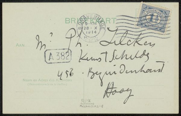 This is a postcard to August Allebé, made in 1916, likely with ink on paper. It's not about an image, but about the gesture of sending, the flow of ink that forms words and directs them toward someone. The writing itself has a beautiful, almost frantic energy. Look at how the letters lean and loop, how the lines sometimes thicken and then thin out, like a heartbeat. There's a rhythm to it, a kind of dance on the page. It's easy to imagine the hand moving quickly, wanting to communicate something urgently. And then there are the stamps and seals, each a little marker of time and place. They’re like tiny abstract compositions, layered on top of the writing. I’m reminded of Cy Twombly, someone else who knew how to make language into pure, sensual mark-making. It’s a reminder that art isn't always about perfect representation; sometimes it's about capturing a feeling, a moment, a fleeting thought. The beauty is in that imperfect translation.