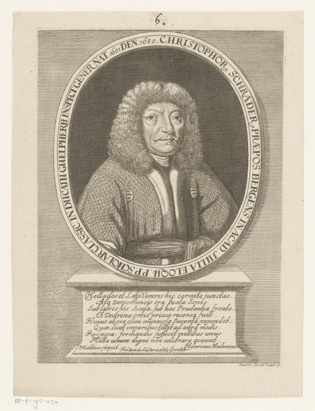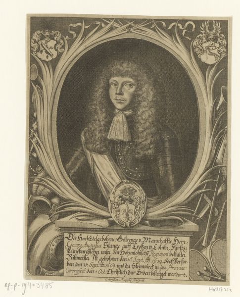 Curator: Here we have a portrait of Ludwig Günther Martini, dating sometime between 1665 and 1721. It's an engraving, a detailed print created by an artist named Christian Romstet. Editor: The immediate impression is of solemnity and formality, wouldn't you say? The subject's monumental wig dominates the composition; its texture, almost cloud-like, contrasts beautifully with the sharp lines of the engraved lettering and crest. Curator: Precisely! Note how the artist employs the intaglio technique to render this effect. The density of the etched lines builds up tone, especially evident in the rendering of shadows beneath the face and within the swirling curls of the elaborate wig. This emphasis on chiaroscuro contributes to the print’s somber atmosphere. Editor: It does. And there is an intricate dance between status and symbolic representation, doesn't it? This wasn't simply a likeness, but a statement of identity—the wig alone signifies considerable social standing in that period. The text inscribed on the print adds another layer, almost like a symbolic caption beneath an icon. Curator: Agreed. The cartouche displays Martini’s coat of arms, but it's the text above that draws the eye, framing the sitter's name within an oval to lend an air of classical refinement. It shows a carefully considered use of available space, adding complexity, a characteristic hallmark of Baroque design. Editor: To your point, this era thrived on emblems and allegories. Beyond status, what meanings were encoded here? Could this imposing visual language offer clues to Martini’s profession, beliefs, and role within his community? The print acts as an echo through time, reminding us of Baroque society's visual rhetoric. Curator: Yes, its rigorous structure showcases a distinct formalism characteristic of portraiture of the Baroque era. Editor: In essence, beyond the fine lines of the print, we witness echoes of Martini's world and our own evolving interpretations, making this more than just a portrait. Curator: Indeed, a dialogue across centuries on representation and persona.