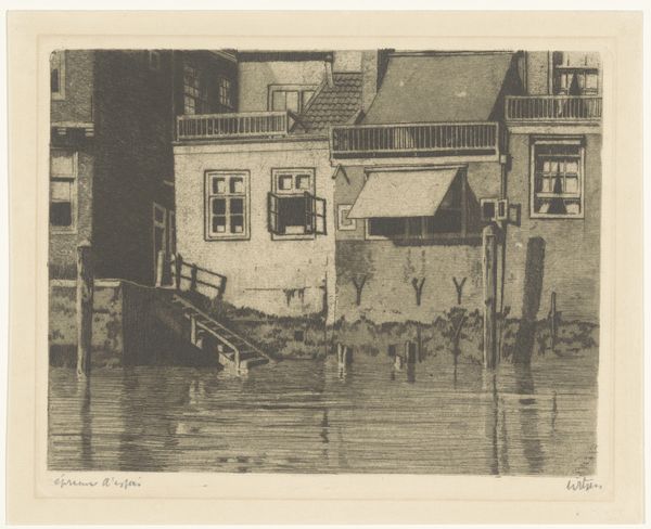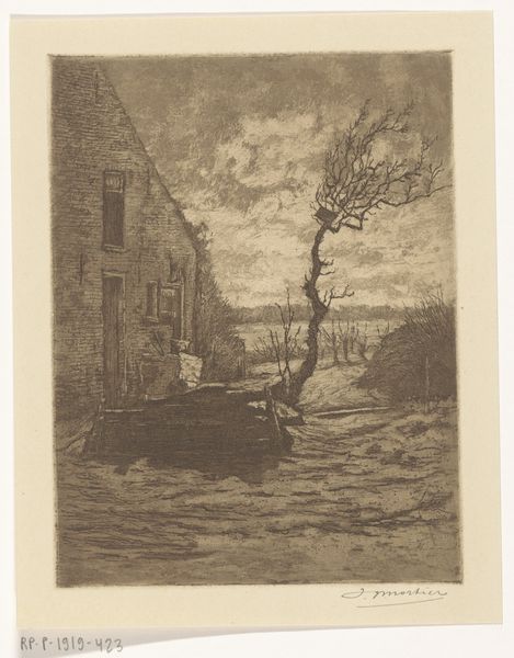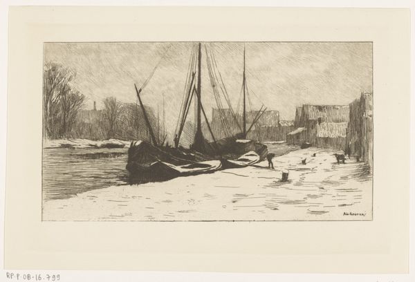 Editor: This etching by Martien Van der Loo, *Stadsgezicht te Mechelen*, likely made between 1890 and 1912, plunges me right into a melancholic winter's day. The sepia tones and the artist's use of line really evoke the weight of a cold climate in a somewhat lonely city setting. What details or aspects of this cityscape draw your attention the most? Curator: Well, darling, isn’t it a gorgeous mood piece? The atmospheric perspective achieved solely through line work really whispers of cold, doesn't it? For me, beyond the technical prowess – and my god, the hatching! – it’s the suggestion of untold stories. See those figures trudging through the slush? What burdens do they carry? What awaits them behind those imposing, snow-dusted facades? What stories do you see in those chimneys billowing a gentle grey? Are they dreams of progress or the heavy sighs of industrialism? Editor: That’s such a vivid way to put it. The burden in their stoop... and yes, the chimneys become symbols in themselves. Do you see Van der Loo's realism here as a detached observation or something more subjective? Curator: Ah, now *that's* a brilliant question! I don’t think he is a dispassionate observer here. He's inviting us to contemplate urban life itself – its beauty, its hardship, its silent narratives etched into stone and shadow. Notice how the architectural forms seem to huddle together against the elements – as if seeking warmth and solidarity in the face of a harsh world. What feeling do you derive from the frozen waterway separating you from those houses? Editor: It creates a barrier but also, a muted connection. It mirrors my own sense of separation but appreciation, really bringing the buildings together and offering an invitation to learn about lives so removed in time. Curator: Precisely! An invitation to consider the echoes of human existence rippling through time, my dear. Just marvelous. Editor: This etching revealed more than I initially saw, layering the scene with an emotive and storytelling quality that adds unexpected depth. Thank you.