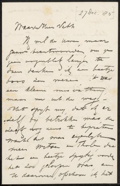 Curator: This is a reproduction of "Brief aan Jan Veth" created possibly around 1889 by Jac van Looij, a Dutch artist celebrated for his intimist leanings. It's ink on paper, rendered in a style evocative of the Dutch Golden Age, wouldn’t you agree? Editor: My immediate sense is one of transience. It appears almost ephemeral—a delicate, fleeting moment captured in cursive ink. I’m drawn to the lightness of the script against the creamy paper. Curator: The stylistic approach here invites an intriguing consideration of intimacy. We often look at letters as more than just correspondence—they're vehicles for closeness, offering glimpses into personal relationships. Van Looij’s commitment to portraiture likely led to its preservation. Editor: Indeed. Observe the composition. The artist lets the writing cascade organically, unrestricted by rigid lines or margins. Each word carries a semiotic weight. Note that heavy darkening over part of the written text, I think to emphasize, but possibly obscuring a word as well? Curator: Exactly. I would propose it serves a visual representation of layered emotion. I read some disappointment—almost an exasperated acceptance. Letters from this period functioned as social anchors; the ink strokes convey the tenor of conversation. I think that heaviness perhaps stands in for frustration. Editor: I see it also in the looping ascenders and descenders; the penmanship betrays something akin to introspection—consider the materiality: thin paper absorbing ink—thought itself manifesting visibly, forming lines on a surface. Curator: Consider too, this might provide insights into the artistic circles of the time. Perhaps Van Looij is critiquing artistic practice—Jan Veth was an art critic—or just arranging dinner. What secrets are being protected or hinted at? It’s a study in layered semiotics as well. Editor: Yes. Analyzing Jac van Looij's handwritten work brings to light those moments suspended in time: daily routines and the aesthetics involved in human interaction. The content matters far less than the action of communicating itself. Curator: A vital observation, reminding us how such artifacts capture not just information but humanity’s enduring need to connect, rendered in a visual syntax. Editor: Precisely. And with that consideration, our analysis comes full circle—back to its essence of impermanence and memory, leaving lingering impressions on us even today.