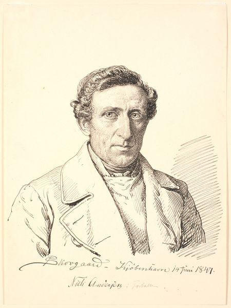 Editor: We are looking at a drawing titled "Portrait of the Artist's Wife's Brother, Christen Christensen Købke", made in 1845 by Christen Købke using pencil. The subject's gaze is gentle, almost melancholic. What is striking is the incredibly delicate rendering of light, almost creating a ghostly atmosphere around him. What are your thoughts? Curator: Indeed. Note the economy of line. Købke uses a reductive palette – the monochrome pencil against the toned paper. This necessitates a heightened awareness of tonal values and how they define form. See how the varying densities of graphite create the illusion of depth and volume, particularly in the fall of light across his face. Do you notice the textural variation? Editor: Yes, I see that contrast now. The artist uses quick, almost scratchy lines to depict the background. By comparison, the details in his face and the folds of his coat are carefully shaded. Is there a particular compositional reason behind the bare background? Curator: The relatively blank background, a formal choice, focuses our attention squarely on the subject. By minimising extraneous details, Købke accentuates the inherent structure of the portrait, directing the eye through a carefully constructed arrangement of forms, shadow and light, compelling us to contemplate not just *who* is portrayed, but *how*. Editor: This has helped me focus less on historical interpretation and more on the skillful artistry itself. I appreciate your insights on its masterful simplicity and the ways it shapes the viewing experience. Curator: The inherent power of visual construction is often overlooked. Observing the structure, the compositional rigor, grants profound insight into any work.