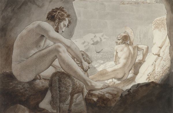 Curator: Let's discuss Will Hicock Low's "Ode: 'Bards of passion and of mirth'," created in 1887. The artwork resides here at The Art Institute of Chicago and is made with charcoal. Editor: My first thought is about its quiet solemnity. The monochrome palette amplifies this. Curator: The title, taken from Keats, is particularly relevant. Low captures an idealized scene of figures within a landscape, evoking both the romanticism of Keats' poetry and academic artistic traditions. Notice the positioning of the female figure; there is a dynamic of watching and being watched here. Editor: The charcoal execution is so interesting. I see it not merely as a preliminary sketch, but as a thoughtful composition that leverages the materials to establish hierarchies. The human figure is finely rendered with precise, visible labor, while the surrounding vegetation fades away. I find that so significant because it draws out what Low sees as most crucial. Curator: Right. And the nude figure coupled with classical allusions presents various gendered interpretations of art and poetry. Her pose almost mirrors a pensive muse or perhaps even Diana. The setting, too, lends itself to classical interpretations, blurring the line between fantasy and historical idealization. Editor: It feels like a constructed Arcadia more than an observed reality. How fascinating it is that we find idealized spaces like these crafted with such meticulous labor using charcoal on paper. Curator: In the context of the late 19th century, Low engages in conversations around artistic and cultural nationalism, crafting visual allegories tied to American artistic identity and historical European standards. Editor: Indeed. It reveals a conscious act of building something, connecting technique and visual narratives to their material realities. It allows us to perceive how meaning itself becomes a manufactured thing. Curator: It leaves us contemplating the constructedness of not just the art, but the ideas they embody. Editor: Exactly! A really fantastic look at the artist's work and labor, even in its 'unfinished' charcoal state.