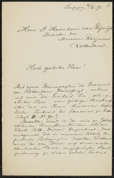 This is a letter written in Leipzig, Germany, in 1892 by Julius R. Haarhaus to Pieter Haverkorn van Rijsewijk. Its existence speaks to the cultural life of the time. In the letter, Haarhaus references portraits of Erasmus in the Museum Boogman, as well as portraits by Dürer and Holbein that include skulls, indicating the writer's preoccupation with art history. The text illustrates the intersection of personal correspondence and intellectual interests of the period. Haarhaus mentions the difficulty in obtaining a photograph of the referenced portrait, highlighting the technological constraints of visual media at the time. The letter touches on issues of identity and interpretation, where Haarhaus discusses how someone mistook the portrait of Erasmus for Calvin, and the importance of details, such as the beard and eyes, in distinguishing these identities. Haarhaus's commentary on art, identity, and perception within the confines of a personal letter transforms it into a window onto late 19th-century thought and culture.