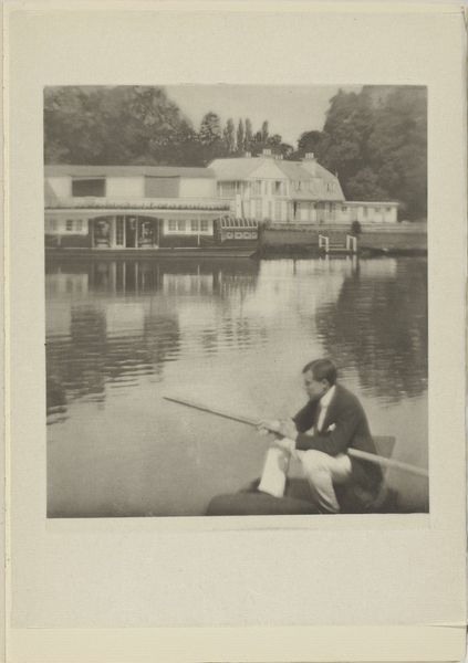 Curator: The piece before us, dated 1913, captures a moment of tranquil leisure. The Rijksmuseum holds this photograph by Geldolph Adriaan Kessler, titled "Portret van Johannes Cornelis Heijning en Margaretha Eugenia Fransen van de Putte in een kano," meaning "Portrait of Johannes Cornelis Heijning and Margaretha Eugenia Fransen van de Putte in a canoe." Editor: It’s lovely—like a page torn from a novel. Melancholy, almost. They seem so proper, so contained, even amidst what should be carefree fun. There is the visual stillness, like holding breath and the lake in front of them reminds me about Virginia Woolf. Curator: That sense of stillness certainly permeates the photograph. Considering the context of the early 20th century, we can understand that formal portraiture, even in informal settings, remained the norm. Their clothing and postures were all performative to class and cultural rituals. Note the white dress on Ms. Fransen van de Putte, with some kind of drapery going all around, also note the little hat on top of her head, quite fashionabble back then, as much as Mr. Heijning's tailored suit with matching tie. The flag could point to the family's social status, too, of course. Editor: Flags always speak volumes, don't they? It’s interesting how the flag, while seemingly indicating a place, a belonging, can also signal exclusion—a demarcation of “us” versus “them.” And you know, it adds a strangely competitive edge to the scene, like, "we are winning the race", that contrasts deeply to the serene image. I'm finding myself imagining their conversation to be utterly forced. Curator: Forced or not, these types of portraits also served to preserve memories. What could a boat symbolise here? What psychological projections where triggered when people sailed in water? The couple canoeing is an old topos in arts. Editor: Right! It might signal the waters of the unconscious, or a journey into unknown parts of themselves. It invites exploration of the deeper meanings, to me, about how they relate each other, in still waters as on wild rivers. I do feel their psychological drama. Curator: A valid point. The landscape itself offers contrasting readings. The smooth lake contrasts the bushy thicket. Do they point to unknown challenges? Does the landscape participate as a subliminal communication? Editor: I'd like to think that both knew very well the undercurrents beneath a superficially harmonious partnership, as it seems! Curator: Well, in either case, the image functions as a beautiful study of a very complex world. Editor: True. A silent poem indeed.