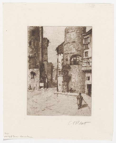 Editor: Here we have Charles Adams Platt's "Inner Temple Lane," likely from the late 19th century. It's an etching, giving it a delicate, almost ghostly feel. I'm immediately drawn to the way the artist captures the wetness of the street; it's almost palpable. What stands out to you in terms of composition and form? Curator: Indeed. The work reveals an attention to linear precision, carefully arranged to delineate space. Observe how Platt establishes depth; the lines subtly thicken in the foreground, creating a sense of immediacy and weight. Furthermore, the texture achieved through the etching technique replicates the slick surface of the rain-soaked cobblestones, doesn't it? Editor: It absolutely does. The use of light and shadow is remarkable too. Is the archway at the end simply a framing device, or does it carry more significance? Curator: The archway serves both functions. Structurally, it offers a frame, but the darkened space behind invites the eye into further planes within the composition. I invite your consideration: what semiotic relationships do you perceive between these meticulously rendered planes and the human forms occupying them? Editor: It’s interesting how the figures are present but not really defined. They are subsumed by the setting, like the environment dictates their existence, perhaps? Curator: Precisely! Note how the architectural mass and its geometry assume preeminence over the human figure. The individuals become subordinate to the formal order of the urban landscape. Consider this, do these formal relationships reinforce any socio-philosophical readings to the Lane itself? Editor: I see your point. Thank you for highlighting these formal aspects. It's fascinating to analyze how the visual language constructs meaning here. Curator: My pleasure. This exercise underscores the richness of visual language itself as a conduit to more expansive readings.