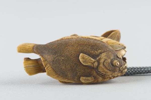 Curator: Here we have a piece titled "Salmon" by Kono Senri, dating back to the 1820s. Editor: It's smaller than I expected. The texture looks smooth, though you can clearly see the tooling marks. Makes you wonder how long the carving took. Curator: Indeed, this work offers a fascinating glimpse into Japanese craftsmanship. Works of this nature have become quite prominent across various public art domains, often seen as icons in ethnographic collections, highlighting a unique convergence of popular tastes and traditions. Editor: It's interesting to consider this piece as a commodity too. How many were likely produced, and what material limitations would have been overcome for their availability in public display? This particular artwork definitely reflects Japan's commitment to artisanal trades. Curator: The salmon, as a motif, carries significant cultural weight in Japan, often symbolizing perseverance, determination, and prosperity, particularly during this time period. They also serve as crucial social metaphors which explain socio-economic systems in the area. Editor: Thinking about those hand tools, did Senri use any unique varnishing? The material condition also leads me to believe he likely intended this to become an indoor item, given its lack of weathering. The level of refinement also puts its market price on a certain level. Curator: Precisely! It makes you reflect upon access, as we see similar approaches to this sort of commodity reflected across diverse global craft communities throughout this era. Editor: It definitely gives a feel for both aesthetic appreciation and market value being woven into a very tactile piece. There’s this very tangible human connection to the artist in the detail work, and understanding labor gives another important lens to value. Curator: And isn't that human connection really what compels us to pause, analyze, and understand. Thank you for your perspective on craftsmanship. Editor: My pleasure. Reflecting on how this piece moved between hands, market influences, material processes—that enriches the whole viewing.