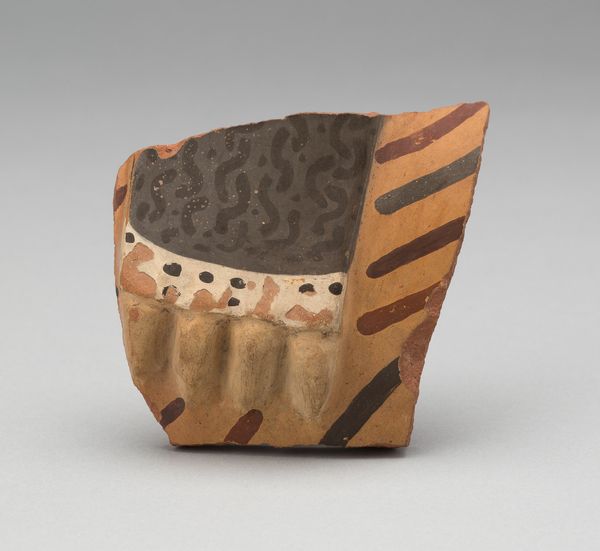 Curator: Here we have a fragment from a red-figure cup, attributed to Makron. It depicts, quite simply, legs of a male figure in a himation. Editor: It's striking how much narrative presence persists in such a small piece. I immediately think about the male gaze, and how this fragment reduces a figure to just legs. Curator: Well, considering its original function—likely used in social gatherings, perhaps even symposia—it highlights the culture of male camaraderie and display. Red-figure pottery, of this time, served both functional and decorative purposes. Editor: Exactly! It also prompts us to consider whose bodies were absent from these gatherings, whose labor produced the materials for this cup, and for whom was this image intended? Curator: True, examining the socio-political context, we can see that it reflects a limited perspective of Athenian society. Editor: The fragment itself reminds us that history is always incomplete. Curator: And the craftsmanship tells us much about daily life in ancient Greece.