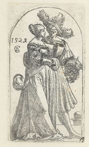 This etching of a noble lady from Paris was created by Claes Jansz. Visscher sometime before 1652. The print, made from an incised copper plate, is relatively small, and the artist has made every mark count, capturing a great deal of detail in the woman's dress, accessories, and pose. We can see her elaborate ruff, feathered headdress, the lace trim of her sleeves, her fan, and the pattern of her dress. What may be less apparent is that all these things - the clothes and fashionable accessories of the wealthy - are themselves products of considerable labor. The textile workers who made the fabric, the lacemakers who produced the trim, and the dressmakers who assembled the ensemble were all essential contributors to this image. This etching prompts us to consider not only the woman depicted, but also the many hands involved in her carefully constructed appearance. As such, it blurs boundaries between fine art and the labor of craft.