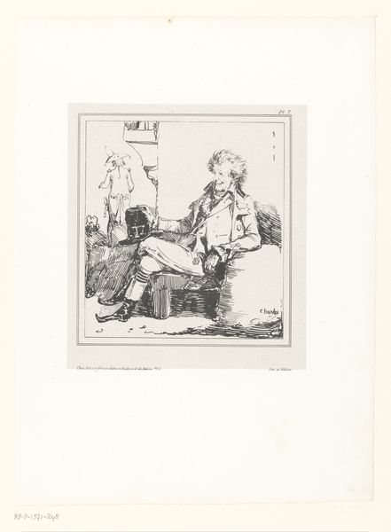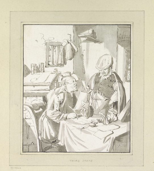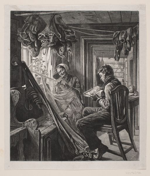 Editor: This etching by H.P. Hansen from 1879, titled "The Man Who Was Supposed to Stay Home," has a slightly melancholic air. The delicate lines create a scene of domesticity, yet something seems off-kilter. What do you see in this piece from a formalist perspective? Curator: The composition itself presents a fascinating interplay. Note the central positioning of the figures, but the way their gazes diverge creates a subtle tension. The intricate details of the interior—the dishes, the window—are rendered with a meticulousness that contrasts with the almost hurried quality of the linework on the figures themselves. How do you perceive this contrast? Editor: I see that the surroundings almost overshadow the characters; their rough rendering makes them feel less present than the environment they inhabit. Is this imbalance important, formally? Curator: Precisely. The relationship between the foreground and background disrupts any clear narrative reading. The use of hatching and cross-hatching in the clothing and furniture creates an interplay of light and shadow that is not merely representational but serves to build visual weight and structure. This moves our analysis away from a story-driven approach towards the internal aesthetic logic. Do you agree that a closer look is rewarding? Editor: Yes, examining the piece's structure draws attention to the formal relationships between line, shape, and texture over any explicit social meaning. I now notice that, instead of being mere filler, each carefully rendered stroke adds structural value. Curator: Exactly. That structured appreciation of its aesthetic essence over narrative assumptions, that is the very heart of formalist exploration.