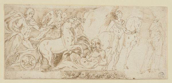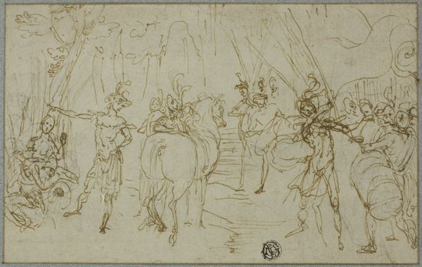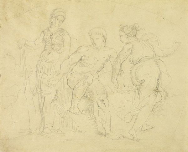 Editor: So this drawing, "Studienblatt: Römischer Lictor und Krieger mit Haupt auf Schild," attributed to Friedrich Moosbrugger, currently held at the Städel Museum, seems like a study of figures in an ancient Roman setting. The starkness of the pencil drawing, combined with the unsettling image of a severed head, gives it an almost clinical feel. What strikes you when you look at it? Curator: The composition immediately suggests a structural dichotomy. Observe the stark contrast between the standing Lictor, rendered with relatively simple lines, and the kneeling warrior, whose form is complicated by the shield and the grisly object it bears. The artist has clearly dedicated more energy to rendering the texture and detail in the latter figure, a deliberate choice that serves to disrupt the visual balance. Editor: So you see the contrast in their forms as being a key part of its meaning? Is the artist perhaps using visual cues to signify power or victory, or some other dynamic between the figures? Curator: Precisely. The artist's control over line and form invites questions about how we ascribe value within a pictorial space. Consider how the light catches the warrior's helmet, subtly directing the viewer's eye, almost like a stage direction. It begs the question: what statement is being made about this scene through this concentration of detail, as opposed to the simpler figure of the Lictor? Are we meant to understand the weight, both literal and figurative, borne by the warrior? Editor: That's a compelling observation. It shifts my perspective. Originally I saw the image as mostly focused on classical history, but perhaps Moosbrugger wanted viewers to analyze how and where we look in the picture plane. Thank you! Curator: Indeed. Focusing on such visual components allows for a deeper comprehension of not only the depicted scene but also the artistry embedded in its execution.