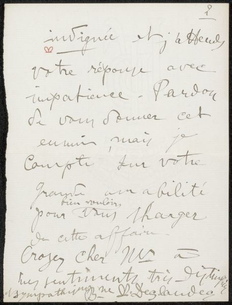 Curator: Here, in the Rijksmuseum, we have "Transcriptie van een brief aan Philip Zilcken," dating from 1867 to 1930. It’s a drawing, pen and ink on paper. Editor: It feels very intimate, doesn’t it? Like a captured moment, a secret glimpsed through the keyhole of history. There's a delicate vulnerability to it. Curator: Absolutely. The texture of the paper, the way the ink bleeds ever so slightly… it’s more than just text. You feel the pressure of the pen, the intent behind each stroke. We're talking about layers of human action rendered on a receptive field of pulp and particulate! Editor: Yes! And the visible corrections, the scratched-out words, reveal the writer’s thought process so palpably! You see that this isn’t just the end result but the struggle, the dance of shaping ideas. Curator: From a formal standpoint, look at how the lines themselves create a rhythm. There is a structural analogy there to musical scores; each dash and loop performs a specific and discrete action within the semiotic architecture of the letter form. Editor: To me, though, it's the *human* element. Letters aren’t merely language made visible—they are whispers across time. Knowing it was destined for Philip Zilcken, perhaps there's encoded meaning that we can no longer know... what was their relationship like? Curator: Perhaps we’re not meant to decipher everything. Its incompleteness is an integral part of the work. The torn edge, the fading ink—they all contribute to a story that refuses to be fully told. Editor: Which I suppose makes it a conversation piece. I can keep it, not locked behind the bars of fixed knowledge but available. It gives this space an extra flavor. I would walk this way to taste this dish.
