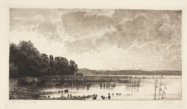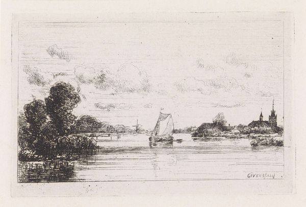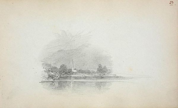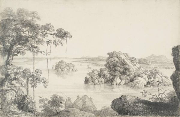 Curator: Hendrik Huygens’ drawing, likely representing a scene at Jodensavanne and dated before 1859, is quite striking. My immediate feeling is a deep, contemplative stillness—the monochromatic graphite lends a hushed quality. Editor: It’s the labor I see. Look at the graphite lines; so economical, used to evoke the river’s slow current and the thatched roofs. The drawing material itself is so unassuming. Yet it bears witness to the structures erected. Who extracted this material? For whom? Curator: Indeed! There's a definite quiet grandeur achieved through very simple means, just graphite on paper. For me it invites questions more than answering them, the haziness around those buildings makes you feel almost in a dream. Editor: Right! These drawings, they give an ordered overview; the artist has carefully organized the elements. Yet, the graphite feels less imposing, it gives us this subtle impression. And what we often forget is how physically demanding making something like this can be. It would take so many hands to clear, fell and shape the graphite from it's source for drawing to occur. Curator: Thinking about those houses nestled on the hill - there’s a subtle story there, isn't there? They feel both permanent and ephemeral. You see a small boat in the water with numerous indistinct passengers. Do we think they are visitors? Editor: We can see the value judgments made visible through Huygens’ work. It’s about land, extraction and ownership, all visualized via fairly common materials in an economic but thoughtful way. The perspective is like viewing a model—the houses feel displayed rather than inhabited. Curator: Perhaps we could view these not just as depictions but as ghostly glimpses into history - a reflection on transience. It encourages a real quiet reflection about the way we record and the legacy. Editor: I’m with you there; Huygens encourages us to consider art-making in social terms through materiality itself: these aren't necessarily luxury goods at the outset but material of transformation and industry. The subtle choice of drawing offers a way to look at the social processes that birthed them.