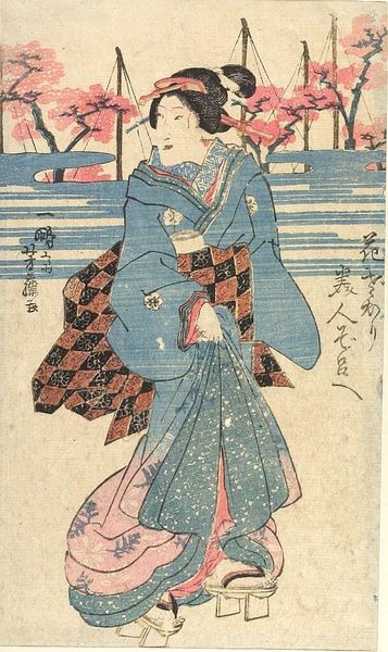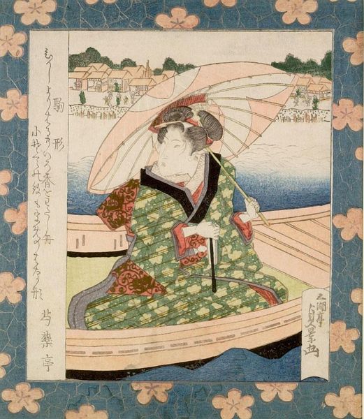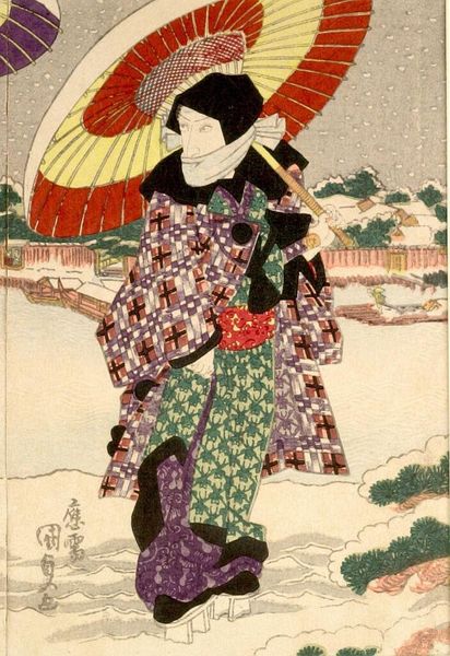 Curator: This woodblock print by Utagawa Kunisada depicts the actor Matsumoto Koshiro V on the Sumida River bank, part of a series exploring "Snow, Moon, and Flowers." Editor: I'm immediately struck by the bold colors against the wintry backdrop; the umbrella's radial design especially contrasts with the falling snow. Curator: Indeed, the printmaking process itself, with its layering of colors and carved blocks, speaks to the vibrant theatrical culture of the Edo period. Editor: And the actor's stance, the tilt of his head, even the way the fabric drapes—it's all so carefully constructed to convey character. Curator: Consider the social context, too. The accessibility of woodblock prints democratized art, bringing portrayals of famous actors to a wider audience. Editor: It makes you wonder about the labor involved, the artisans meticulously carving each block. Curator: Exactly. This small print reveals a whole network of production and consumption. Editor: So much to consider in such a compact format. Curator: Indeed. A window into both artistic technique and social history. Editor: Thank you. I learned more about the process.