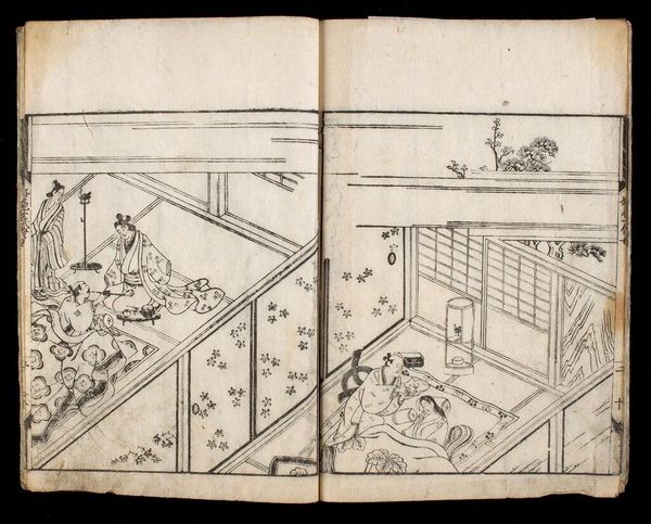 Editor: Here we have a page from "The Woman Who Loved Love," illustrated by Yoshida Hanbei. It's a black and white woodblock print, and I’m immediately struck by how much is communicated with so few lines. What stories do you think the artist is trying to tell? Curator: The spareness is the point, isn't it? Like a haiku, it hints at a world of longing and fleeting beauty. These interiors, these figures caught in moments of quiet ritual, they speak to the ephemeral nature of pleasure. Do you sense a subtle melancholy woven in? Editor: I do. It's there in their stillness, a sense of longing, perhaps? What do you think about the composition of two distinct spaces? Curator: Yes, those separate spaces invite us to consider the different facets of this woman's life, the public and the private, the stage and the quiet reflection. And perhaps, the inescapable solitude even amidst company. It’s a study of contrasts, isn’t it? Editor: Absolutely. I hadn't thought about it that way. It really changes how I see it now. Curator: Art's like that; each glance reveals something new, a whisper of untold stories.