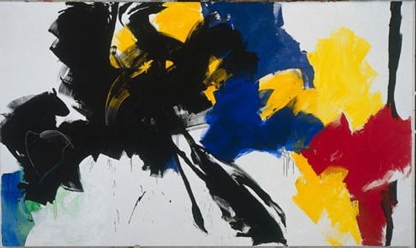 Curator: Ernst Wilhelm Nay's "Seraphim" is a vibrant, large-scale canvas. The interaction of color and gestural brushstrokes strikes me first. What stands out to you? Editor: Well, the material quality of the paint itself is pretty evident. How do you think the application and layering contribute to the overall effect? Curator: It's crucial. Look at how Nay uses thin washes versus thick impasto. The means of production highlights the artist's labor. Consider what the flat picture plane signifies against traditional representation of religious figures. Editor: So, you're saying the lack of traditional subject matter and emphasis on materials challenges the 'high art' status associated with religious paintings? Curator: Precisely. It shifts the focus to the act of painting itself, questioning notions of skill and spirituality in art production. Editor: That's a great point; it makes me see the painting in a completely different light!