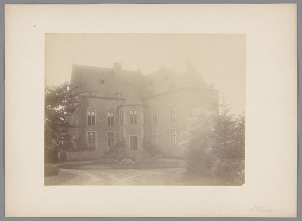 This photograph, titled "Planten- en vogeltuin in Arnhem" by J.S.J. de Jongh, presents a stately building amidst manicured nature. The sepia tones evoke a sense of nostalgia, but also direct our attention to the formal composition. The photograph is structured by a strong contrast between the rigid, geometric architecture and the organic, flowing shapes of the surrounding greenery. The building's facade, with its repetitive windows and defined cornices, creates a grid-like pattern, a display of order and control. This is set against the soft, diffused forms of the trees and bushes, which introduce a sense of natural variation. The composition employs a sophisticated play of perspective, drawing the eye towards the vanishing point along the building’s length. This technique is reflective of a broader 19th-century interest in capturing and representing spatial depth, but also in the contrast between nature and culture. This interplay invites us to consider how constructed spaces interact with natural environments.