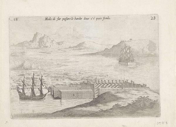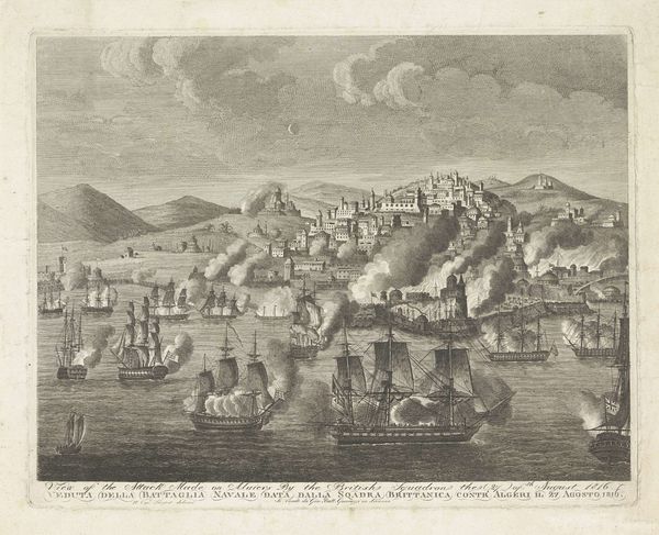 Johannes Kip created this print called "Gezicht op Musschat" in the late 17th or early 18th century. The composition is immediately striking for its use of receding planes, which guide the eye from the ships in the foreground to the city and the distant mountains. Kip masterfully uses line and hatching to create depth and texture. The density of lines increases in the foreground, rendering the ships with remarkable detail, whereas the mountains in the distance appear softer, achieved with lighter, more sparse strokes. This technique not only adds a tactile quality to the print but also reinforces the perspective, inviting viewers to lose themselves within the scene. The aerial perspective flattens the urban landscape into a semiotic system of buildings and walls, which signify civilization against the backdrop of nature. Consider too, the banner at the top, carried by cherubic figures. It imposes a European framework to understand and contain the Eastern landscape. The print transforms the city into a symbol, mediating viewers' perceptions of space and power.