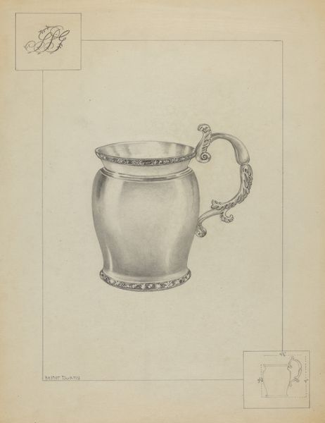 Editor: So, this is "Silver Mug," a pencil drawing on paper, created around 1936 by Horace Reina. It feels…quiet. Almost meditative in its simplicity. The smooth gradients give it a certain depth, despite being a study of, well, a mug. What catches your eye when you look at this piece? Curator: It's the precision, isn’t it? Reina really *saw* this mug. Think about what it means to render silver – how the light dances across its surface. He's chasing that fleeting gleam, the whisper of reflection. He reduces something mundane to line and tone. Did he stop to savour what it represents in his daily life, or was the mug selected simply for being an accessible item? I'd suggest he was attempting to unlock its inherent visual secrets! Editor: That's beautifully put. The way the handle curves – it’s so delicate compared to the solid base. Curator: Yes! It’s a wonderful juxtaposition of line versus volume, function versus form. This feels like more than just an exercise in realism; he is not trying to impress but reflect the intrinsic characteristics, creating space for a bit of magic. What would you use this drawing as if you owned it, as something with which to measure life or just see? Editor: Maybe it’s a prompt to find beauty in the everyday. Now, that little technical drawing in the corner suddenly makes sense—showing measurements! He was concerned with structure and art. Curator: Absolutely. That’s why I keep coming back to this image, to remind myself that elegance doesn’t have to be grand. Simplicity can be profound. Editor: I never thought I’d find a mug so fascinating! This makes me see these subjects with an enlightened mind. Thanks!