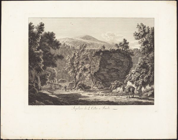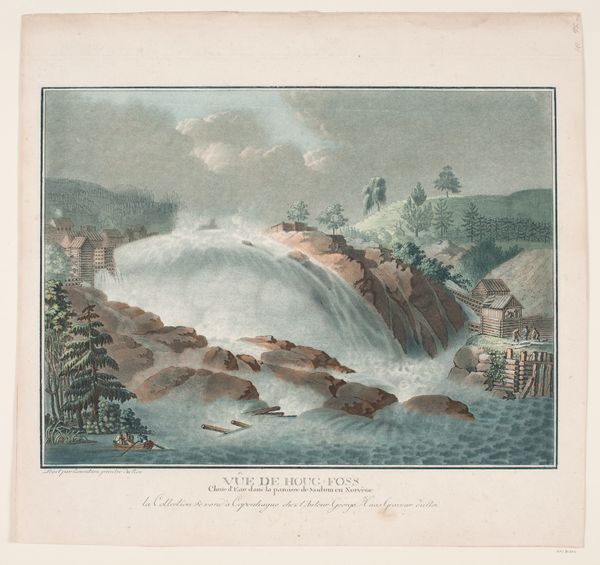 Editor: We're looking at "Cataracte près de vieux Brugs Hammer," a print using aquatint and watercolor, created sometime between 1788 and 1792 by Georg Haas. It feels almost…theatrical. Like a stage set, with the waterfall as a grand backdrop and these little figures and cows acting out a play. What pulls you in when you look at this, what do you see? Curator: Well, the 'stage set' idea isn't far off, you know. Consider Romanticism. They loved nature, sure, but a very curated version of it. And Georg Haas wasn't just showing a pretty waterfall. The human drama, that everydayness against nature's grand spectacle - is the real draw. Do you notice how everything converges toward the waterfall, drawing our eye? Editor: Yes! The lines of the trees, the path, even the way the people are positioned. It all points to that cascade. But I also can't help feeling like it's a little… distant? I'm admiring it, but not *in* it. Curator: Exactly! This distance is intentional. Romanticism wasn't just about pretty views, but evoking emotions. Think about the word ‘sublime.’ This is designed to inspire awe, maybe even a little bit of healthy terror! This is nature saying "I'm grander than you" Editor: That makes perfect sense. I can almost feel that sense of the sublime now, with a touch of performance sprinkled on top. Curator: Perhaps that's Romanticism: emotions performed for a select audience. Though, I do wonder what Haas was actually trying to say, a riddle wrapped in swirling aquatint, if you will... Editor: Absolutely! And all those delicate details and careful gradations... Makes you wonder how much time Haas took to get it just right. Thank you for the insights! Curator: My pleasure. Every little detail, another layer to the story. Another world we now enter.