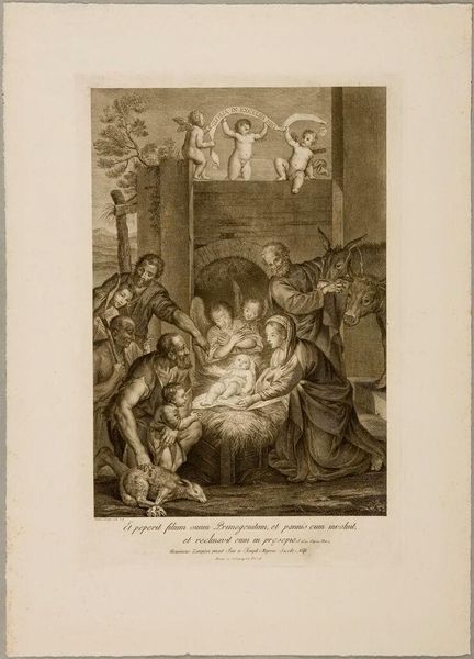 Curator: Domenico Cunego created this intaglio print, titled "Annunciation." Look at the composition: angels above, the Virgin and Gabriel below. Editor: The contrast and line work evoke a dreamlike quality, almost as if it is not of this world. Curator: Indeed, consider the socioeconomic context in which Cunego operated. Printmaking allowed wider distribution of religious scenes, catering to a growing consumer market. Editor: The dove, the cherubs, the halo—these motifs create a narrative of divine intervention, carefully structured through light and shadow. Curator: A narrative made possible by the skilled labor required to produce the plates used to create the prints and allowing mass consumption of religious iconography. Editor: Regardless, the work's serene symmetry leaves an enduring impression of hope. Curator: Yes, a beautiful result of the intersection of faith, labor, and material conditions.