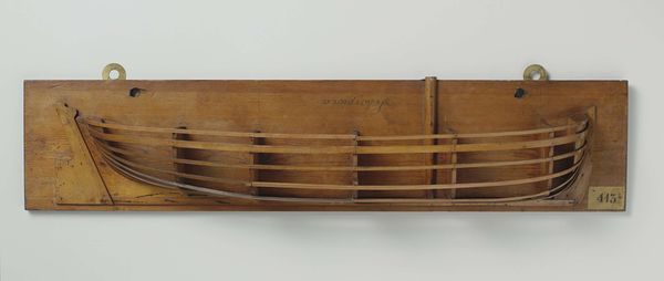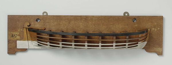 Curator: This object, dating back to 1806, is a "Half Model of a 15-Gun Gunboat with Sliding Keels." The creator, who remains anonymous, crafted this from wood. What are your initial impressions? Editor: There’s a real austerity to it, isn’t there? The exposed internal structure makes me think of a flayed creature or the architectural rendering of a ghostly ship. There’s an echo of vulnerability, perhaps unexpected for a war vessel. Curator: Precisely! Its form tells a compelling story of craftsmanship and utility. These models weren't merely decorative; they were crucial design tools. The grid-like internal structure showcases the joinery required to create this type of naval vessel. We're looking at the nuts and bolts, the labour involved. Editor: And even at this scale, the linear elegance speaks to a larger ambition. The dark timber suggests resilience, but also the countless journeys over turbulent waters. Ships were symbols of both exploration and dominion, emblems of an age. Do you feel this connects to something broader? Curator: Definitely. The materials speak volumes. Wood, obviously vital to shipbuilding, also reflects the depletion of natural resources during periods of expansion. These gunboats supported imperial aims. How different from a finely detailed miniature in ivory! Editor: Yet even in its robust design, there is an aspirational element. Looking closely, I sense a deep cultural memory invested in naval power. For many, it likely embodied ideas of security and progress, all communicated through a visual shorthand. Curator: Absolutely. And while neoclassical aesthetics favour symmetry and order, consider that the necessity of war – reflected by each gun emplacement that would have been part of the complete build – disrupts the equilibrium, revealing complex moral layers of power and control at the beginning of the 19th century. Editor: What a journey to excavate this symbol. Curator: Indeed. From the timber yards to maritime encounters, a lot can be inferred from studying what this object truly represents, layer upon layer.