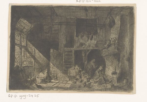 Curator: This etching, “Jonge struikelende man valt op een vrouw die wordt geschilderd,” created around 1766 by François Philippe Charpentier, strikes me immediately with its Rococo sensibility. It feels lighthearted and chaotic at once. Editor: Chaos is certainly the word. Look at how the male gaze functions here— the clumsiness of the male figure disrupting the scene underscores the performative aspects of courtship. This is rife with gendered power dynamics. Curator: Tell me more. I’m primarily drawn to the formal composition. The way the artist utilizes a limited palette of sepia tones and varied etching techniques. Consider the clear, firm lines versus the looser, softer crosshatching used to create depth and shadow. It all points toward an intended layering and a sense of spatial recession. Editor: I read something far less delicate and composed here. The awkward tumble seems deliberately constructed to underscore the precariousness of the female artist, disrupted, literally fallen upon by this man’s actions. How can she assert agency under the male’s overwhelming and literal weight? Where is her voice here? Curator: But doesn’t this reading ignore the genre tradition it resides in? It belongs within the traditions of lighthearted, domestic mishaps characteristic of French Rococo! Perhaps it speaks less about overwriting agency and more about capturing fleeting, imperfect moments of domesticity? Editor: Perhaps, but to simply accept the traditional framing risks sidestepping the obvious critique here: what does it say that in a world depicted through male creation we still only get to witness female stories interrupted by them, silenced by them? Even the interior here is less personal and more of an exposition of available props of ‘domesticity.’ Curator: That’s a valid viewpoint, certainly, especially for contemporary audiences. It adds an additional interpretive layer. What strikes me now is the deliberate staging involved here, this sense that behind these mishaps we are merely watching an allegorical performance of "life." Editor: Yes! Though, as a counterpoint, if that life privileges and gives access to the male artist, while obstructing the narratives of their female counterparts, then whose play are we actually watching, and to whose intended audiences, I wonder? Food for thought.