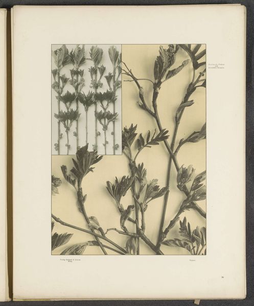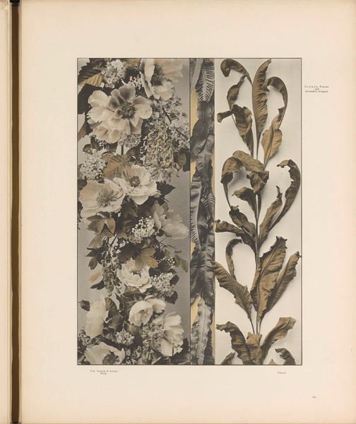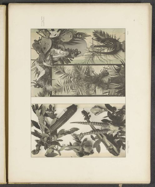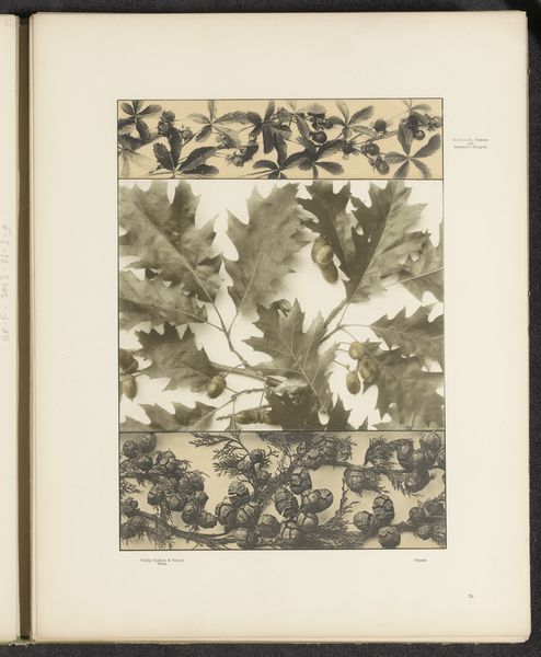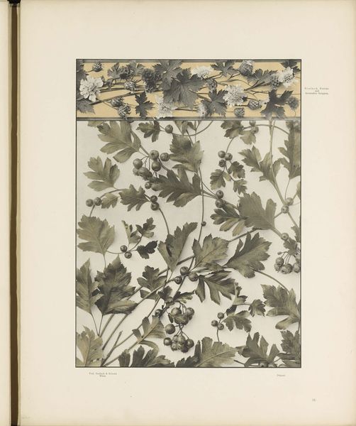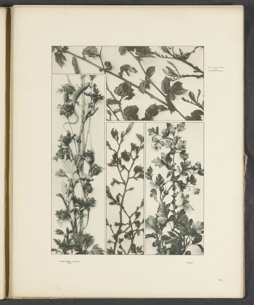 This is a grayscale print titled "Vlakken met esdoornbladeren, aalbessen, pimpernoot en klaproosbladeren," which translates to "Surfaces with maple leaves, currants, bladdernut and poppy leaves." Given the botanical subject and the printmaking technique, it likely originates from late 19th or early 20th-century Europe, a period when interest in the natural world intersected with developments in mass reproduction. The print's arrangement of plant studies within defined geometric shapes points to the rise of design education and pattern-making for industrial applications. As new art schools opened across Europe, there was a renewed interest in the relationship between art, design, and the decorative arts, and how these could be applied to manufacturing. This print, produced anonymously, highlights the crucial role of educational institutions in shaping artistic production. Further research into design schools of the period, trade publications, and botanical illustration would illuminate the social and institutional context that made this image possible.
