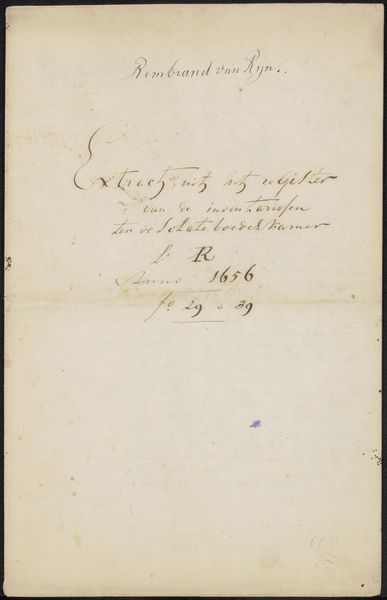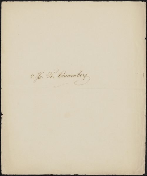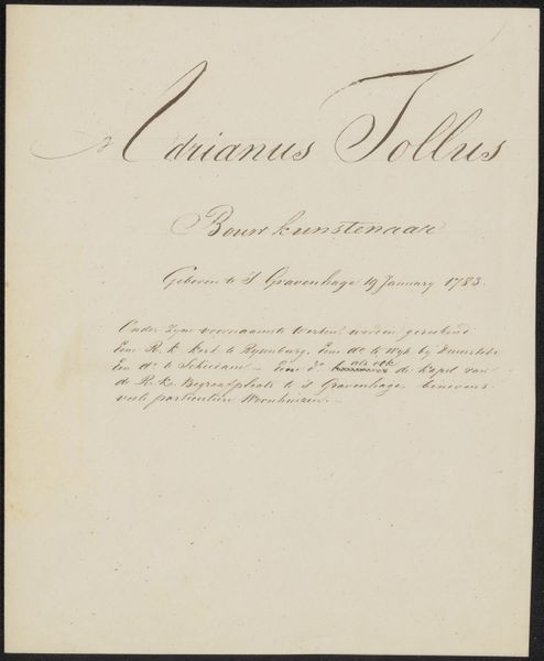 Curator: We're looking at a handwritten document, "Handschrift betreffende Adriaan Noordendorp," created between 1790 and 1833 by an anonymous artist, executed in ink on paper. The delicate line work immediately catches the eye. Editor: It feels rather restrained. Almost bureaucratic in its formal presentation, yet there’s a beauty in the sheer elegance of the script. The curves seem so deliberate and mannered. Curator: Precisely. The calligraphy functions beyond mere legibility; the looping ascenders and descenders create a visual rhythm. It echoes architectural drafting, considering the document concerns Adriaan Noordendorp. Editor: Indeed! His name floats above, proclaiming his importance, especially coupled with the reference to being a 'bouwmeester,' a master builder of royal palaces and national buildings. We see pride woven through symbolic declarations. It grounds him and us. Curator: Notice, too, how the darker, heavier strokes emphasize key words. These bold contrasts create a clear visual hierarchy within the otherwise subtle texture of the overall image. Editor: Those shifts in weight suggest a considered pace of inscription, perhaps a meditation on the act of record-keeping itself. Bureaucracy elevating itself! A beautiful irony if this is meant for some mundane, practical use, don’t you think? Curator: I find the blank space around the text fascinating. It isolates the script, creating a sense of reverence for the information presented. The negative space becomes active, drawing attention to the meticulous details within. Editor: The sparseness focuses us on the enduring role of building within societal identity and ambition through carefully chosen textual anchors. The calligraphic design acts almost like a carefully considered family crest. Curator: Studying this script prompts reflections on our evolving relationships with writing, and perhaps also the transition to mass-produced documentation. Editor: Agreed. And the careful application in monochrome reinforces that somberness while celebrating this master builder of grand institutions. An emotional connection, however subtle, endures through time.