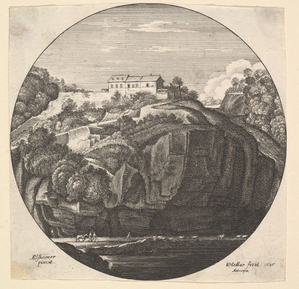 Israel Silvestre created this print, "Gezicht op Castel Nuovo," using etching techniques. Silvestre, a draughtsman, printmaker, and publisher, was a member of the French aristocracy, appointed drawing master to the Dauphin, the eldest son of Louis XIV and heir apparent to the French throne. During this period, the grand tour was fashionable, especially for young men of means, and the cities of Italy were a popular destination. This print, therefore, speaks to 17th-century European identity, one defined by class and wealth, enabling travel and leisure. Consider, too, the figures in the foreground. We are invited, by Silvestre, to look at them looking at the city. Prints like this one played a crucial role in shaping perceptions of foreign lands. Rather than a snapshot, this view is carefully composed, picturesque. The artist has framed the image with foliage in the foreground, creating a sense of depth and inviting the viewer to imagine themselves within the scene. In this way, Silvestre's etching not only documents a place, but also shapes the viewer’s experience and understanding of it.