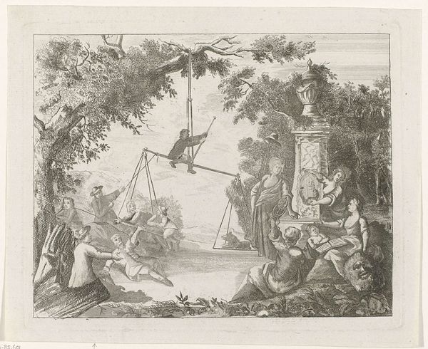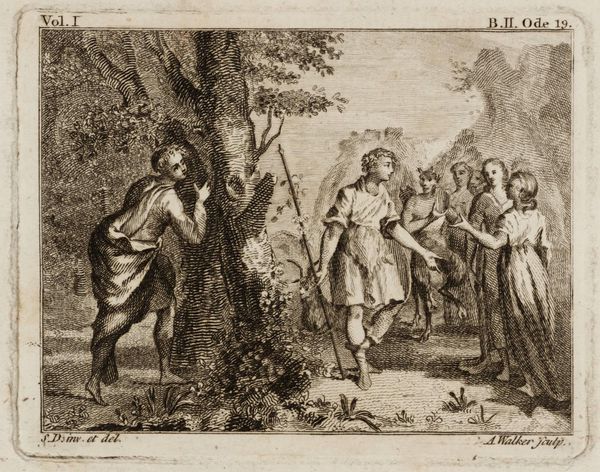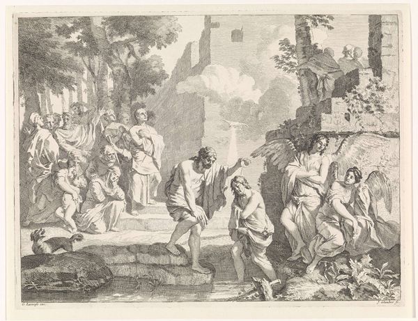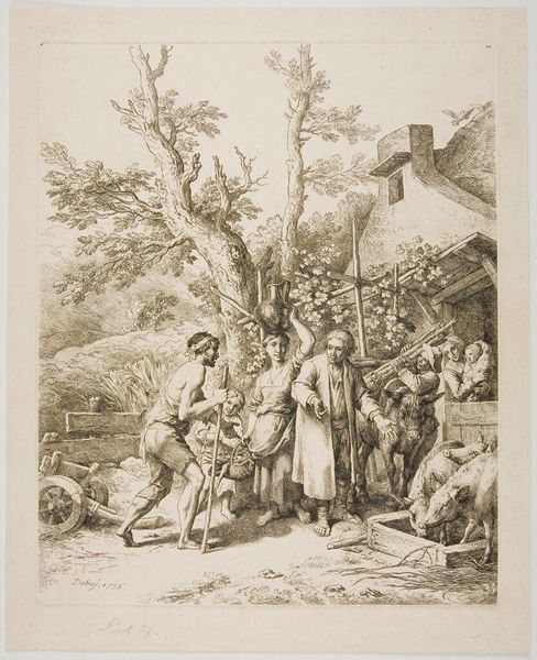 Editor: This is Christian Wilhelm Ernst Dietrich's "Prodigal Son," an etching from the 18th century. It's quite detailed, but somber. What do you see in this piece? Curator: It’s interesting to consider how Dietrich uses the biblical story. Who has access to redemption in this scene? Is it only the son, or is the father also implicated in a system that demands such dramatic displays of penitence for forgiveness? Editor: That's a compelling point. It reframes the power dynamics, right? Curator: Exactly. Consider the labor and resources of the estate, the figures surrounding the father. How might they feel about this situation? What's represented and what's silenced here? Editor: I never considered that. So, it’s less about individual failing and more about the economic and social structures at play? Curator: Precisely! And how those structures impact individual relationships and societal expectations of repentance. Editor: Thanks, I am seeing this familiar parable in a very different light now. Curator: Me too. There's always more to uncover, which is what makes art so engaging.